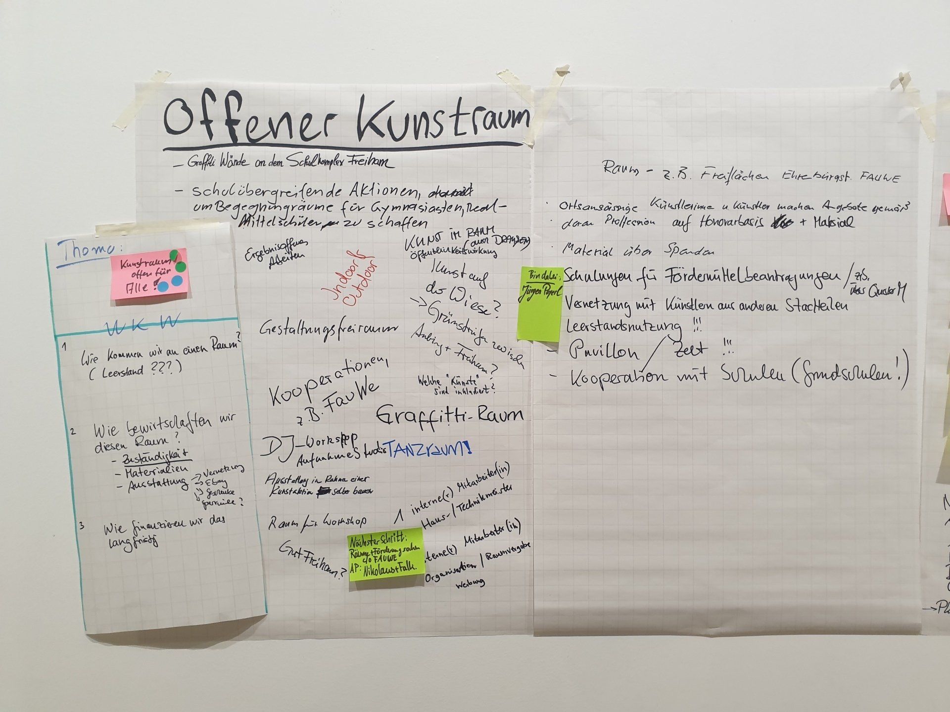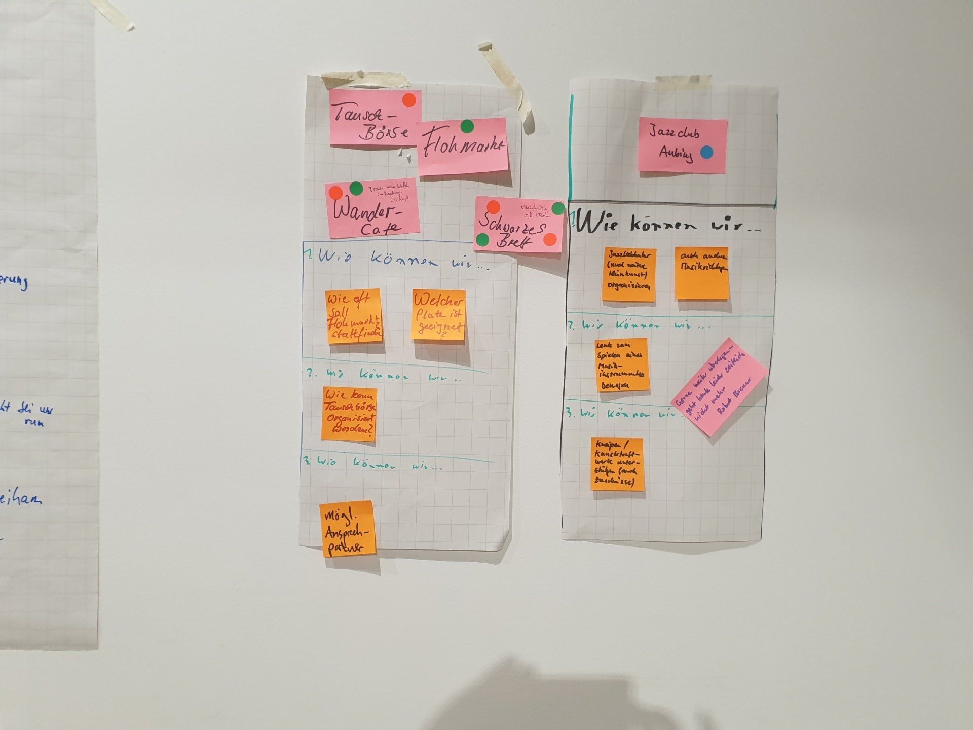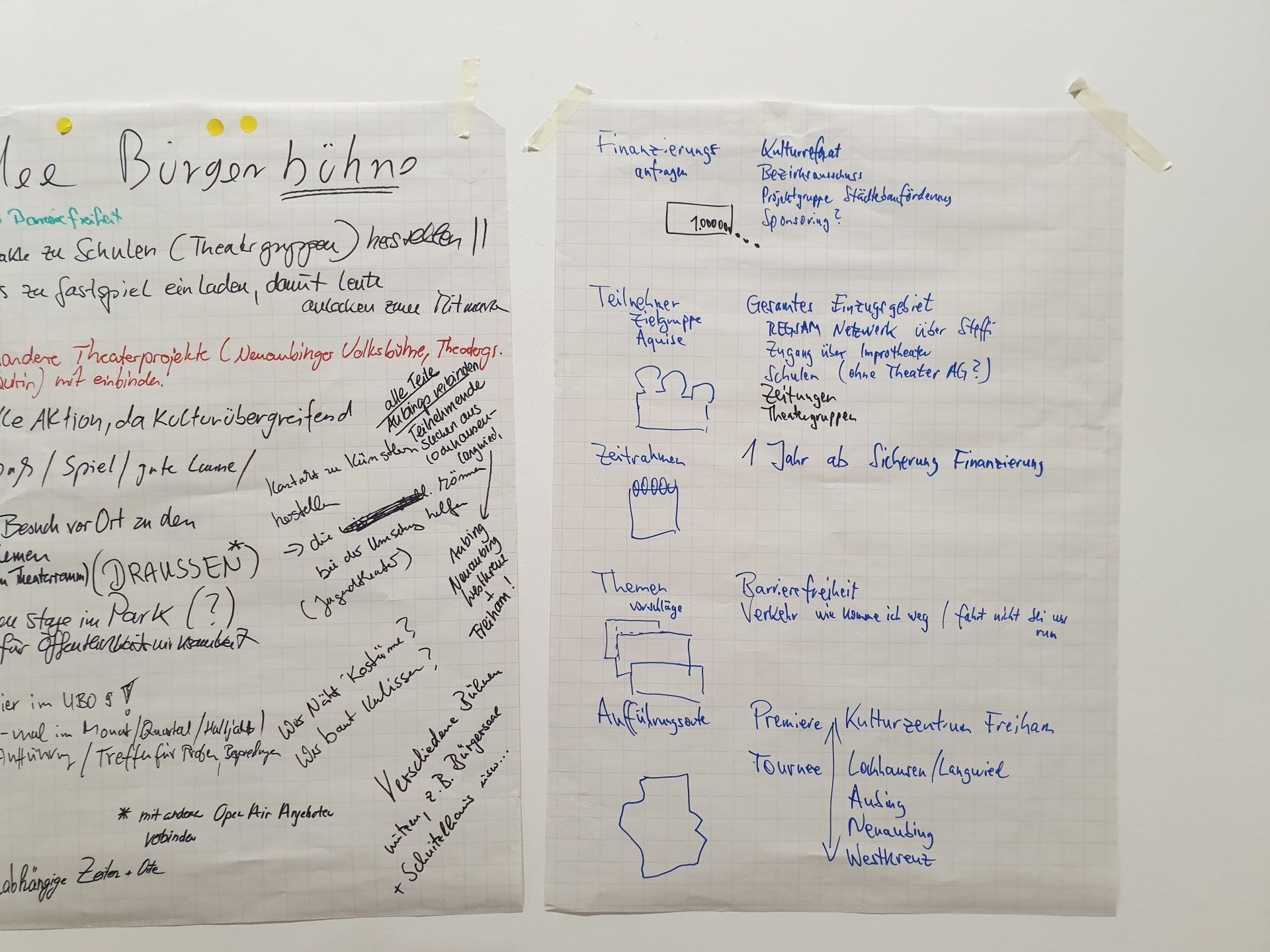Folgende Projektideen wurden in Gruppen weiterentwickelt: Bürgertreff mit Vereinsheim, Bürgerbühne, offener Kunstraum, open air Bühne, Barrierefreiheit mit Kunstaktionen erreichen und einfordern, Angebote für junge Menschen.