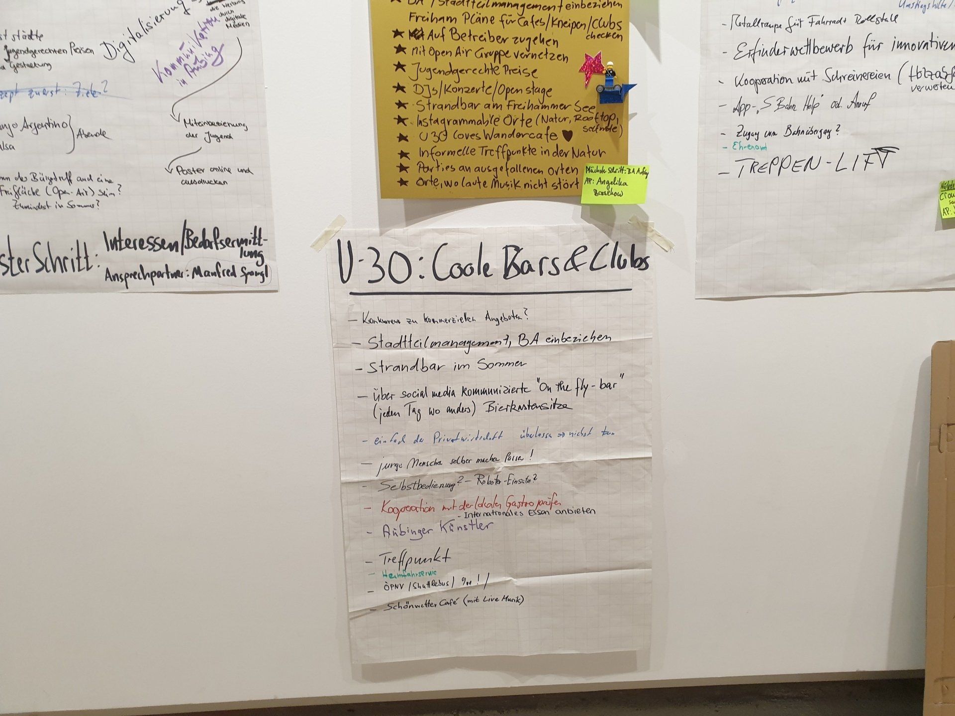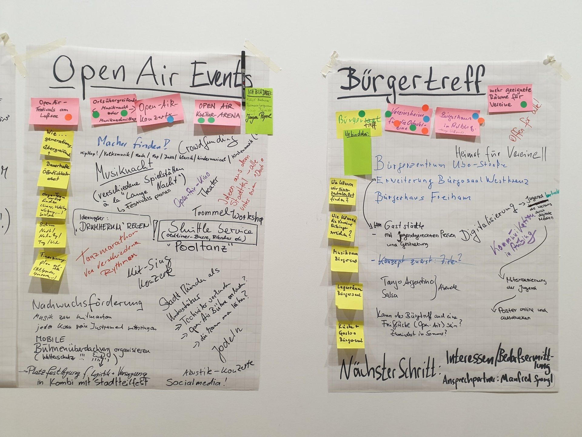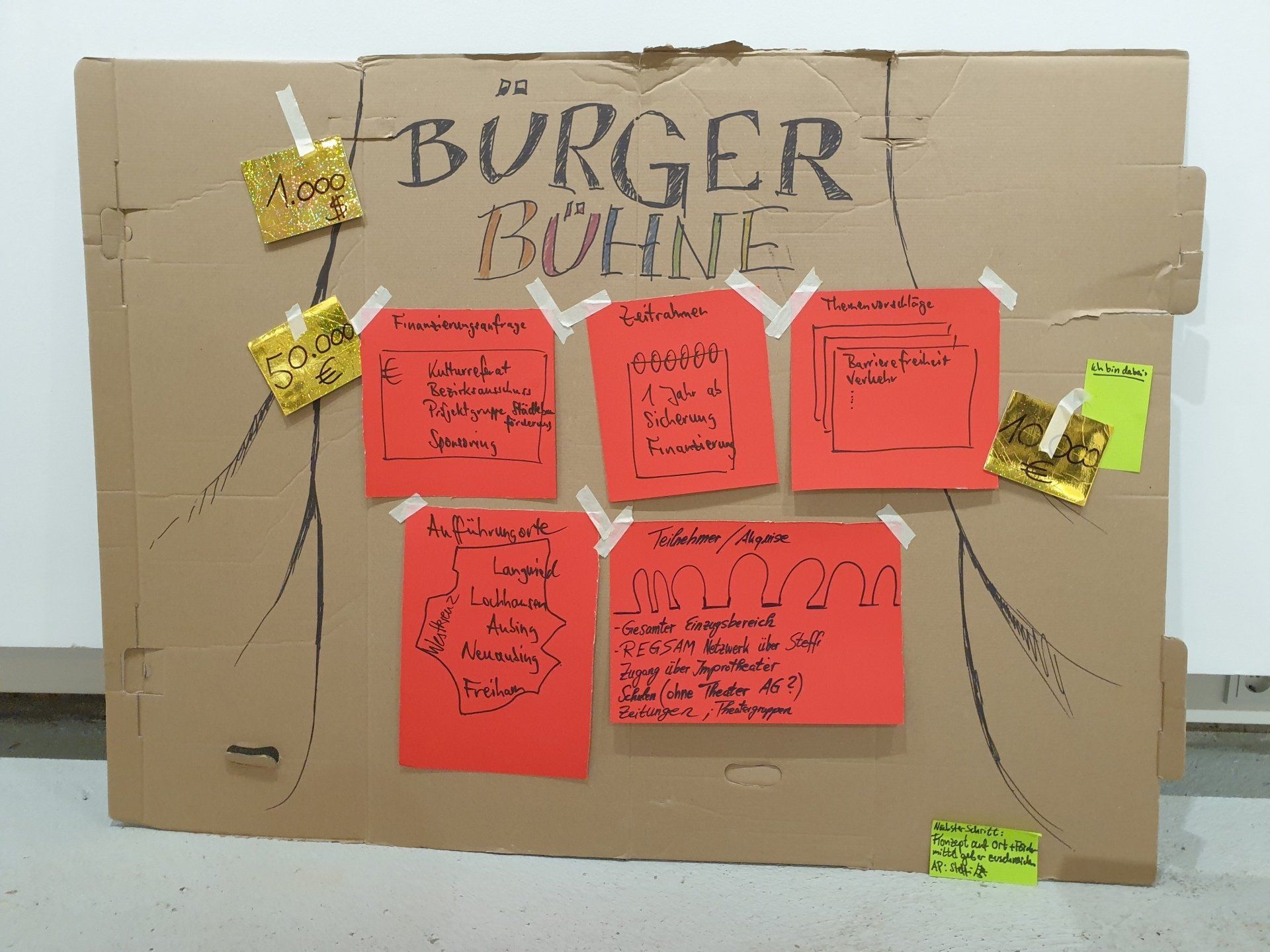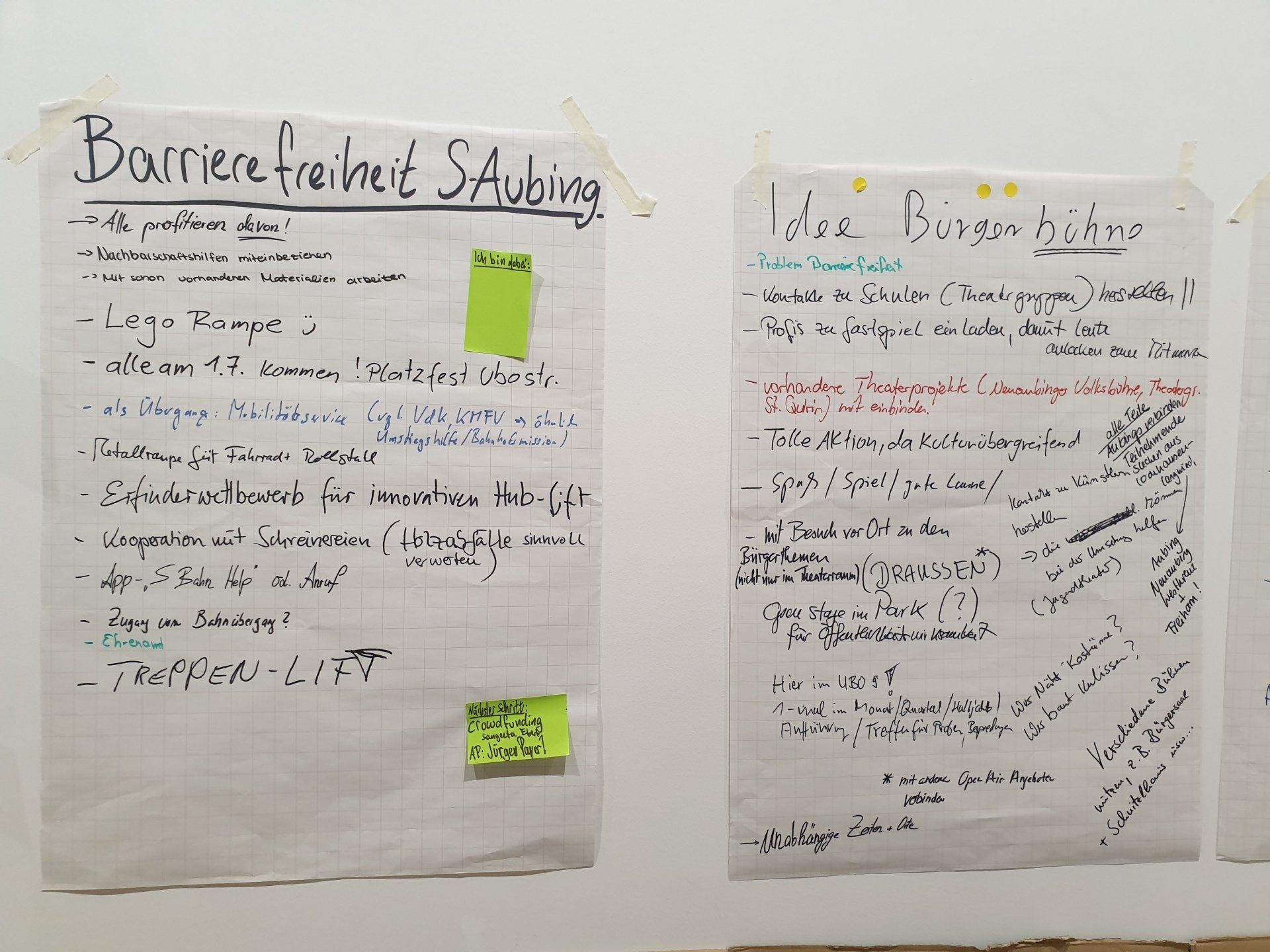 Folgende Projektideen wurden in Gruppen weiterentwickelt: Bürgertreff mit Vereinsheim, Bürgerbühne, offener Kunstraum, open air Bühne, Barrierefreiheit mit Kunstaktionen erreichen und einfordern, Angebote für junge Menschen.